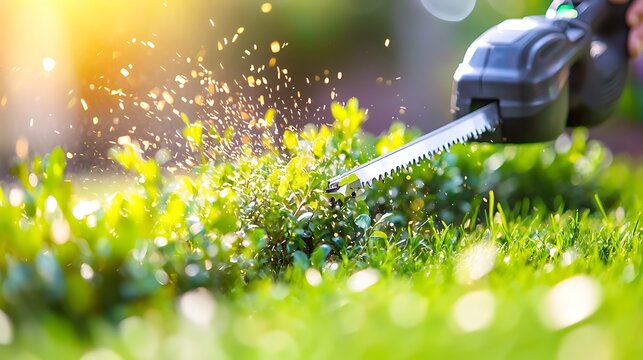 Close-up of electric hedge trimmer cutting vibrant green bushes, water droplets flying in sunlight.