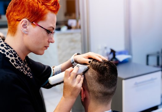 Barber giving a haircut to a man with a beard using an electric trimmer