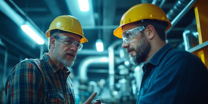 Technician Consultation on Equipment Repairs, Tools and Equipment in Background, Bright Even Overhead Lighting