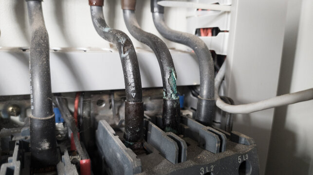 Burning switchboard from overload or short circuit on wall close-up. Circuit breakers on fire from overheating due to poor connection or poor quality wires. Dangerous home electrical wiring concept