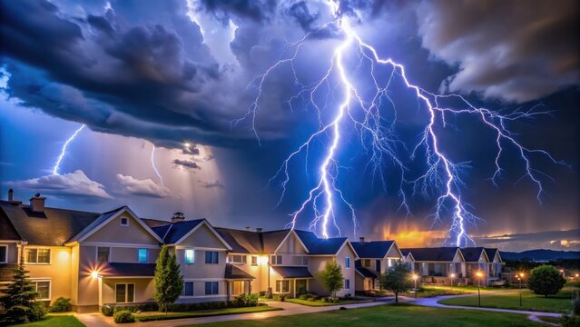 Lightning strike behind a residential building during a storm, lightning, strike, behind, residential, building