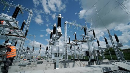 Electrician repairing electrical power lines on utility pole against the sky and clouds background, dangerous work at height