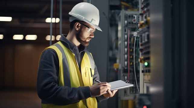 Engineer inspecting and checking datasheet.Engineers check the preventive maintenance documents after the operation.