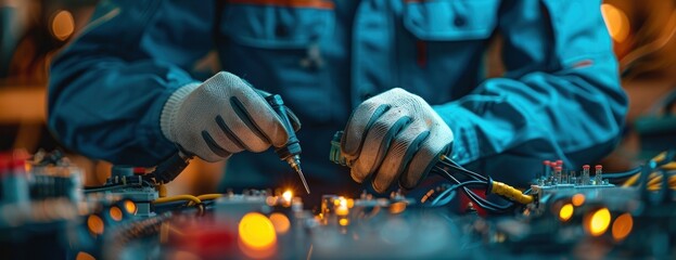A technician wearing gloves works on electrical panels in a professional environment, ensuring safety and efficiency.