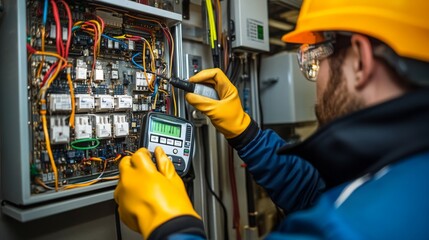 An electrician in safety gear inspects a control panel, using a multimeter to check electrical connections and circuitry.