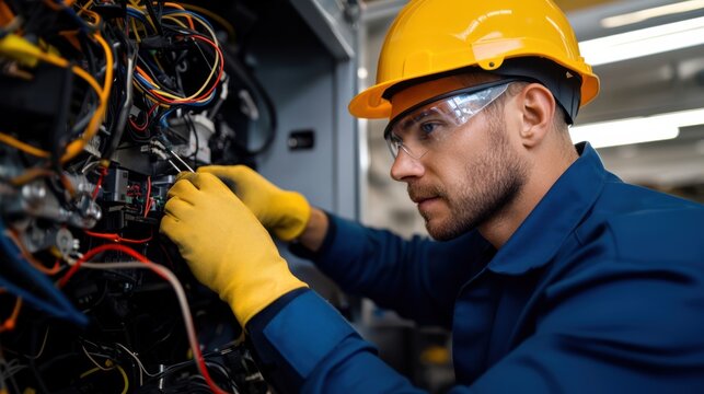 A technician in safety gear repairs electrical equipment, focusing on wires and components.