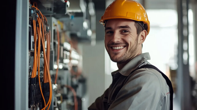 Smiling electrician working on electrical panels wearing a hard hat in a bright industrial setting during daytime