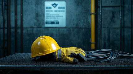 A carefully staged scene with a yellow helmet and gloves on a metal table next to a thick electrical cable, with a safety poster visible on the wall behind