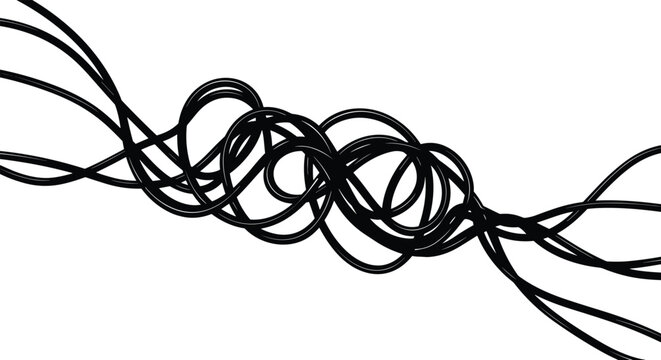 Tangled electric cables and wires chaos illustration, messy power line connection, abstract black and white vector art symbolizing confusion and complexity.