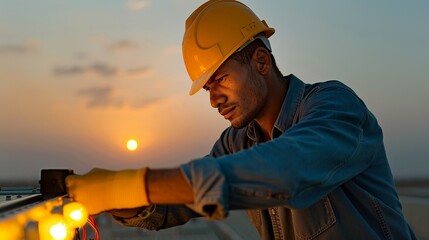 Double exposure of an engineer working on electrical systems, silhouetted against twilight, representing the hard work and modern technology in the industrial sector Illustration, Image, , Minimalism,