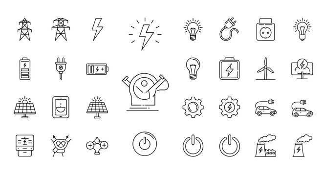 Set of line icons representing electricity and electrical equipment, including power lines, lightning bolts, light bulbs, batteries, solar panels, wind turbines, electric cars, power outlets, and
