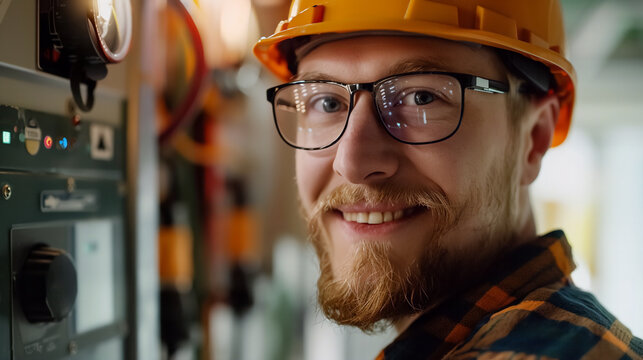 Caucasian worker electrical engineer in a helmet, protective glasses, in uniform, adjusting industrial electrical equipment, portrait of an electrician at a plant
