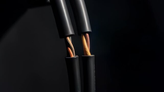 Electrical cable with exposed wires on black surface. Suitable for electrician services, power supply themes, diy projects, equipment maintenance.