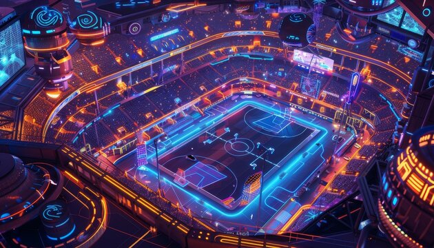 Produce a dynamic digital illustration of a futuristic sports arena, glowing with neon lights and high-tech gadgets, showcasing the integration of data analytics into live games