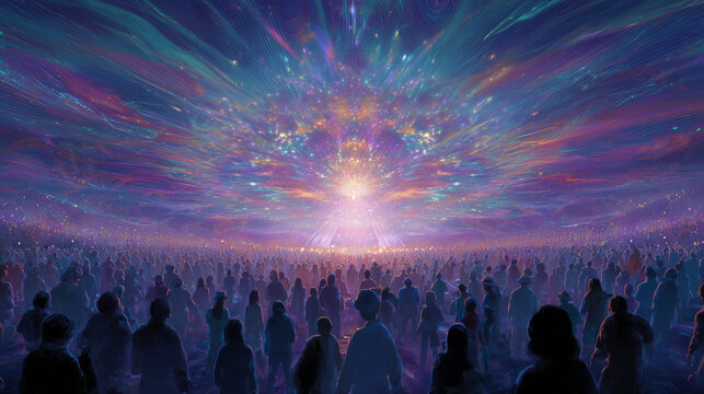 A lively crowd of enthusiastic fans passionately worships and enjoys the electrifying atmosphere during a vibrant music performance at a bustling indoor venue in the evening