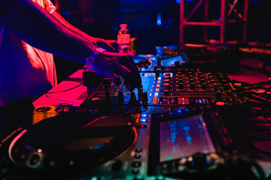 DJ mixing tracks on a booth in a nightclub with colorful lasers show. An amazing club atmosphere with a lof of people dancing to electronic music