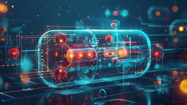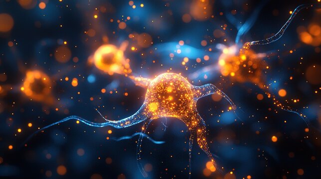 3D Rendering of Neurons with Glowing Particles in a Sci - Tech Background