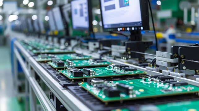 Robots assembling intricate circuit boards in an electronics manufacturing facility, robotic electronics assembly, precision production.