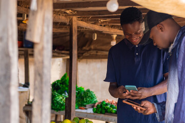 African market man and customer performing transaction for payment in a african market, Man paying bills. cashless policy concept, internet banking