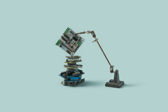 Circuit board with components in rotation. Extreme close up of green electronic board, with electronic components.