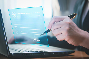 Electronic signature concept and technology and online document management (DMS) for paperless offices. Businessman uses pen to sign electronic documents on virtual screen digital document.