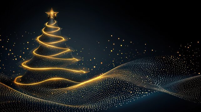Abstract Christmas tree of golden light against a dark background. Possible use Digital greeting card, poster, or website banner