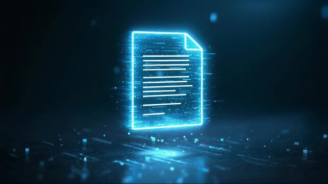 Digital document with glowing lines on dark background, representing office workflow and file transfer concept