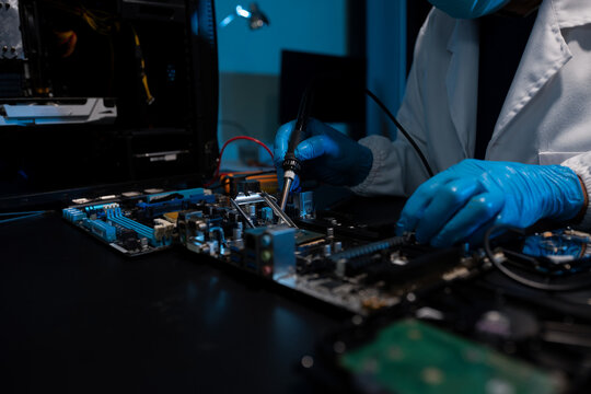 Hardware diagnostics. Electronic parts. Engineer fixing laptop.