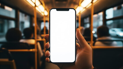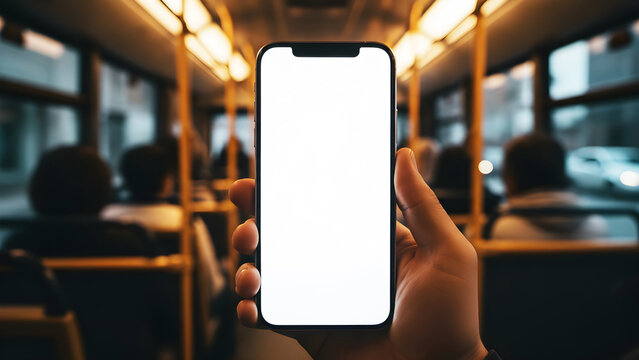 Hand holding mobile smartphone with blank white screen mockup inside public transport bus with passengers background for app design website display copy space branding marketing web