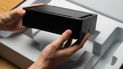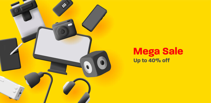 Smart gadgets and kitchen electronics 3d render composition of desktop with tablet music box and other on yellow background