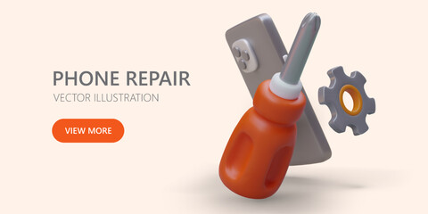 Advertising banner of phone repair service. 3D screwdriver, smartphone, gear with shadows. Firmware. Time to fix gadget. Poster with place for text, logo, promotional offer