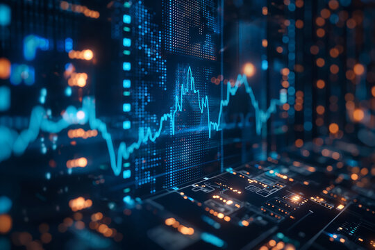 A digital illustration featuring a glowing green circuit board with an upward trending graph in the center, surrounded by various icons representing finance, security, and technology