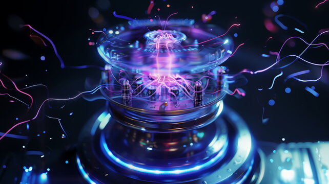 Futuristic smartphone with battery charging indicator on screen placed on wireless charging pad with glowing neon rings on a dark surface