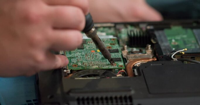 professional talented engineer repairs a laptop and motherboard with a soldering iron. Service center. Slow motion, guy works with a soldering iron. laptop charging cord repair