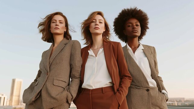 Three confident businesswomen stand together with poise, showcasing stylish tailored suits as the sun sets behind a vibrant city skyline. Their strong presence reflects empowerment and elegance