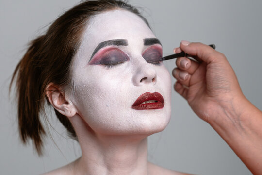 The close-up shot captures the delicate process of makeup application, focusing on the woman's serene face with closed eyes, highlighting the professional technique and artistry involved.