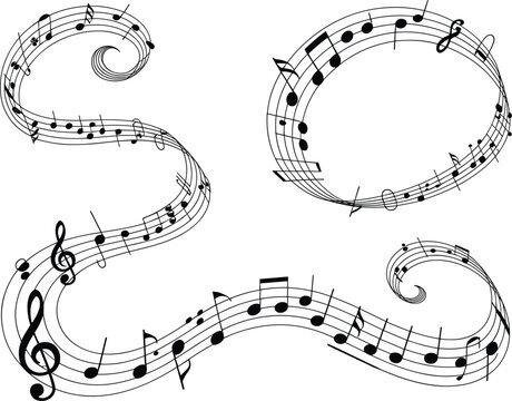 Music notes wave. Flowing musical staff lines with notes, clefs and melody rhythm patterns in dynamic circular, spiral and wavy shapes. Elegant swirling compositions for music posters. Vector set on w