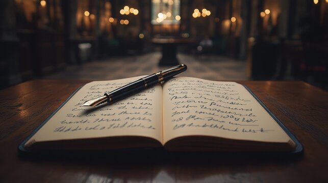 Premium fountain pen with intricate details placed on an open notebook, symbolizing sophistication and elegance