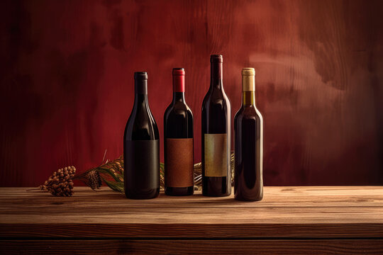 Vintage wine bottle with an elegant label displayed on a wooden table on a red background.