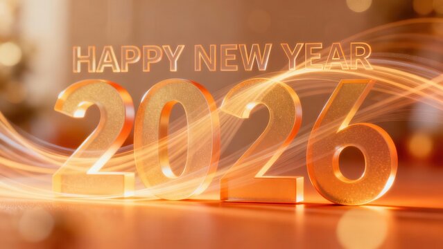 Happy New Year 2026 golden numbers, elegant and celebratory, announcing the new year, against a blurred bokeh background