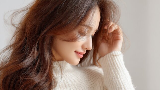 A woman with long brown hair is dressed in a white sweater, showcasing a graceful and elegant appearance under soft light.