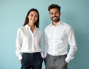 Smiling woman, man stand side by side wearing crisp white long-sleeved collared shirts, professional trousers. Studio portrait clean, modern attire suitable for corporate casual workwear mockups,