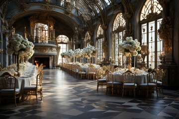 Modern and stylish interior design of a wedding ballroom with a touch of luxury and prestige. Created with generative AI technology.