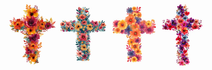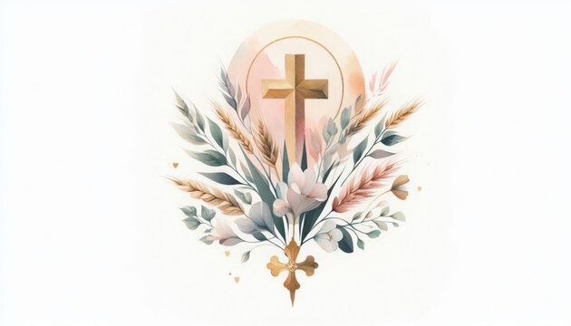 Christian cross with watercolor flowers perfect for Easter communion cards. Floral religious design featuring spring blooms,  and elegant botanical elements for baptism invitations.