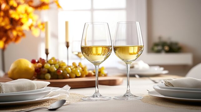 chardonnay. A crystal-clear wine glass filled with golden chardonnay, set in an elegant dining arrangement. bar promotions, beverage menus, designed for product packaging and bar promotions.