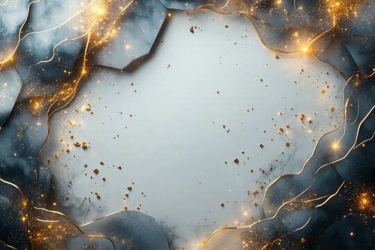 Golden lines and particles swirling around a light blue copy space with marble frame