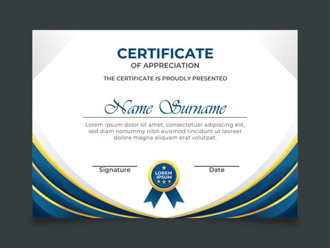 Certificate of appreciation template, gold and blue color. Clean modern certificate with gold badge. Certificate border template with luxury and modern line pattern. Diploma vector template