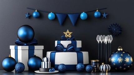 Elegant blue and white festive decorations featuring gifts, ornaments, and a cake for a celebration or event.