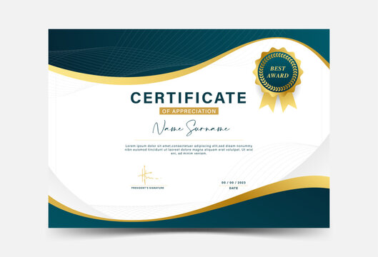 Award certificate template fancy green color gradation with gold border wave