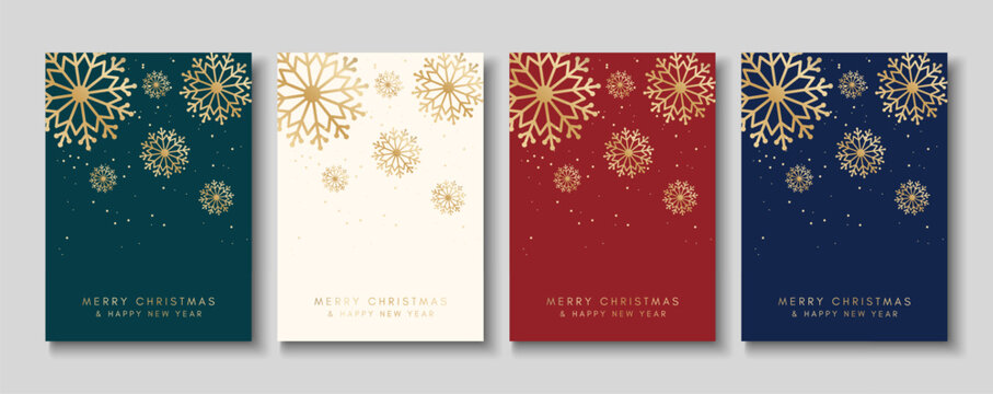 Merry Christmas and Happy New Year! Luxury brochure covers, golden snowflakes, cards, greetings, posters, holiday vector illustrations set.
